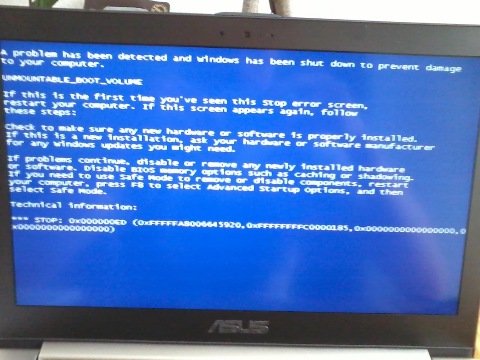 Mein Problem ist, dass Windows nach einem Absturz und dem folgendenden Abschalten des Notebooks nicht mehr hochzufahren ist. Anbei ein Bild des Bluescreens mit der Meldung "unmountable_boot_volume". Dieser kam nur ein Mal, danach wollte Windows nicht mehr hochfahren.