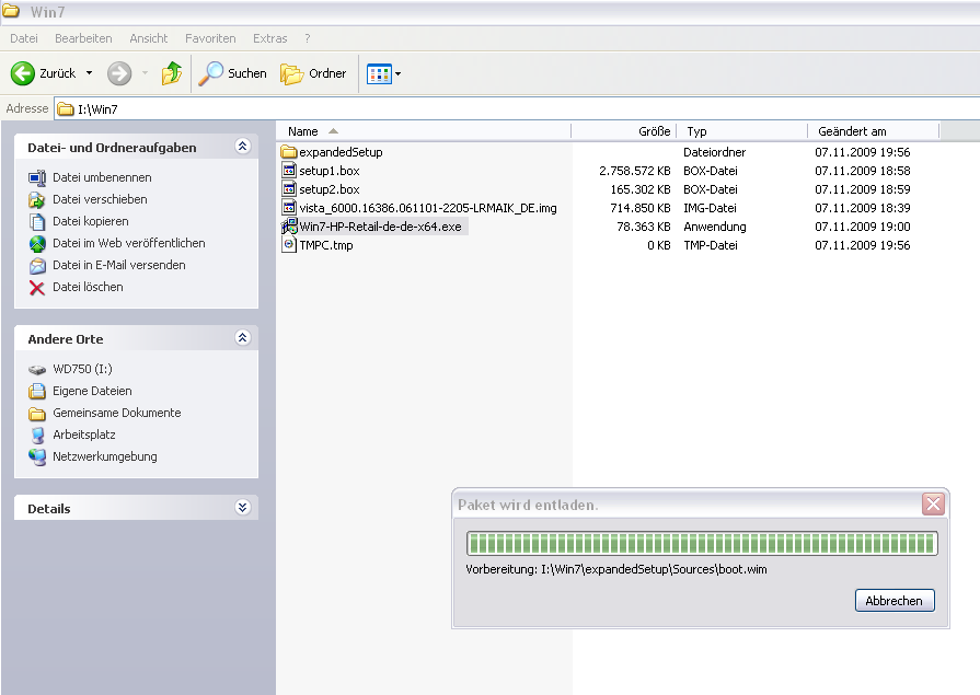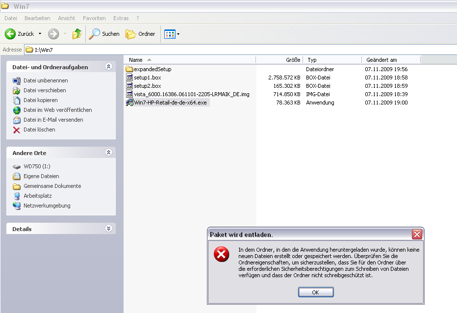 Ich besitze von Win7 die vergünstigte Studentenversion, doch leider schlägt das Entpacken der 3 heruntergeladenen Dateien immer fehl. Nach dem Herunterladen des Downloadmanagers (DLMWin7HP64DE.exe) und dem Ausführen des Entpackers (Win7-HP-Retail-de-de-x64.exe) wird wie vorgesehen der Ordner "expandedSetup" erstellt. Der Entpackungsprozess läuft bis zum Schluss durch doch dann kommt die Fehlermeldung.
