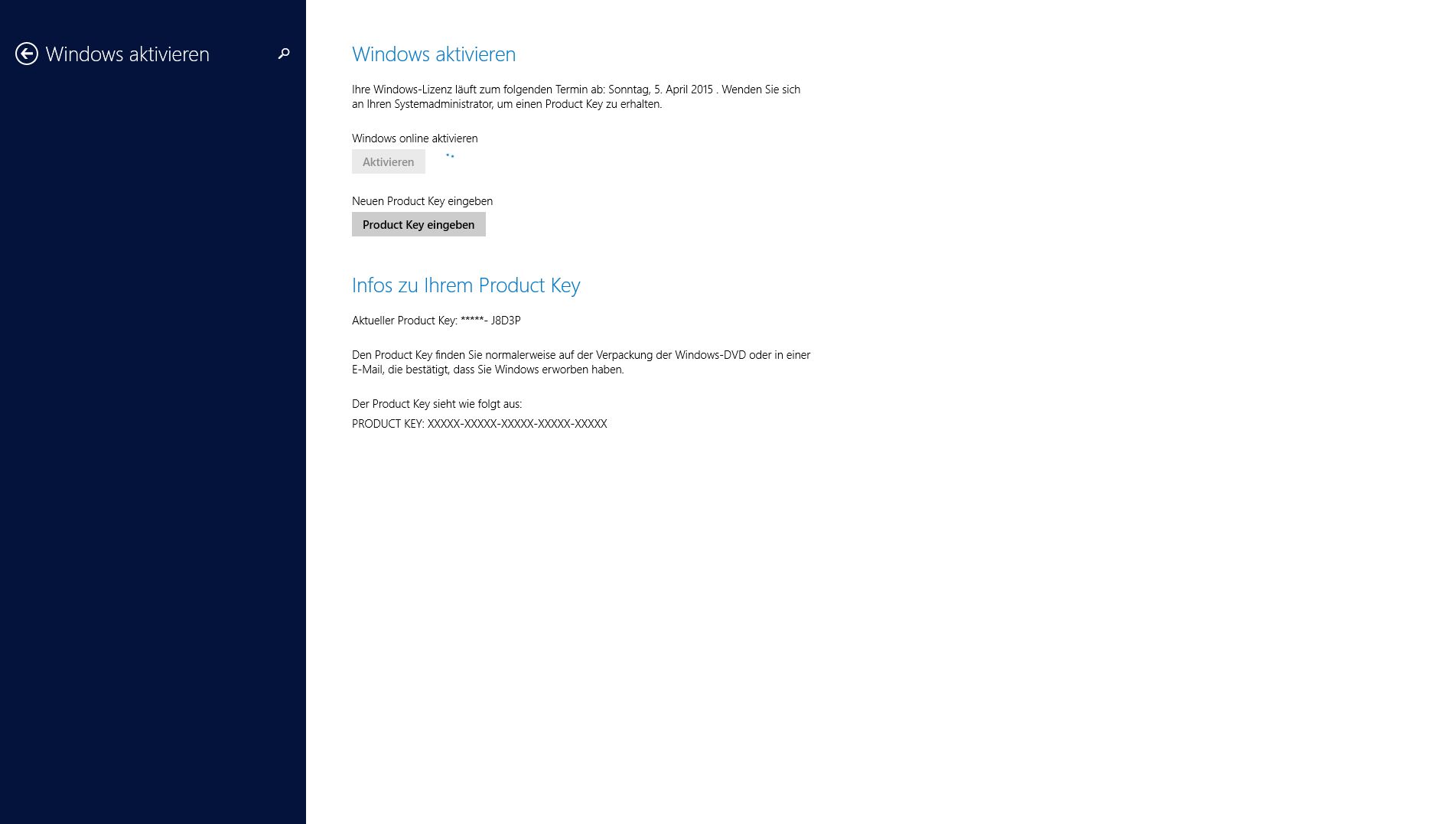 Screenshot: wenn ich auf "Windows online aktivieren" klicke, lädt es einfach und es passiert nix weiter, nach einer Weile kommt dann . Wenn ich den Key neu eingebe kommt: "Ihre Windwos Lizenz läuft bald ab", gebe ich den Key neu ein kommt: "Mit dem Key stimmt etwas nicht!"