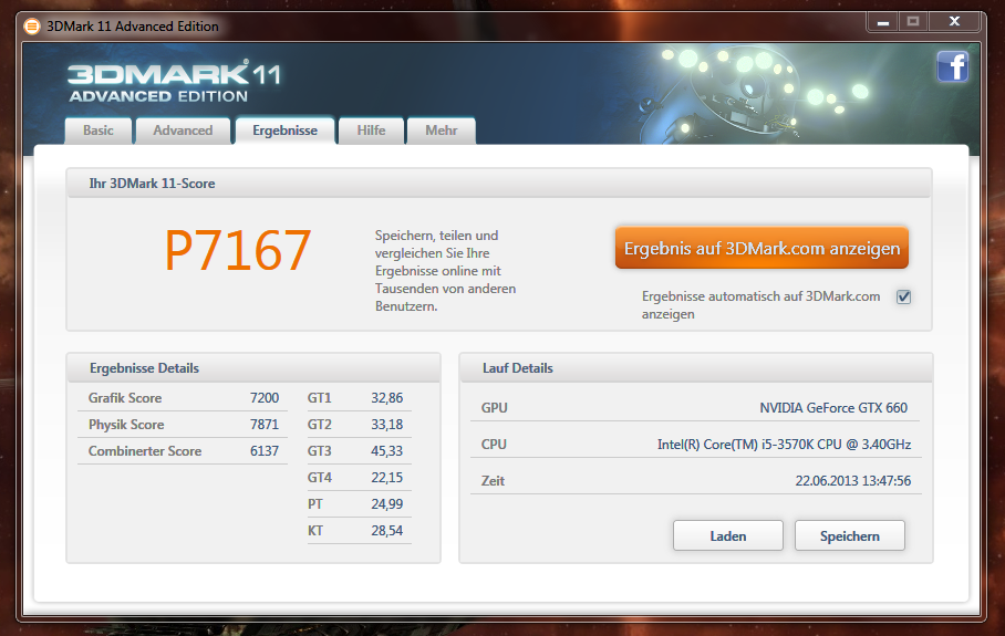 Des weiteren habe ich mir 3D Mark 11 in der Basic Version runtergeladen und den Test gemacht - Ergebnis -ich weiß nur nicht, ob es für meiner Hardware entspricht: