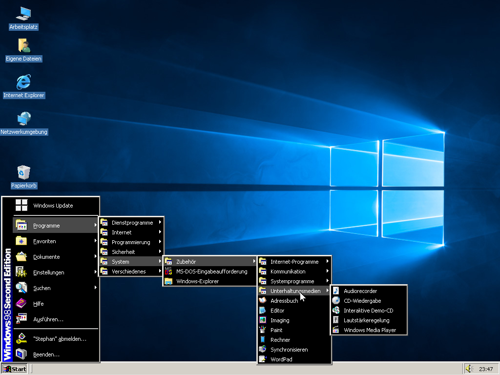 Und zwar habe ich seit gestern ein neues Projekt am Laufen. Ich möchte über eine Virtuelle Maschine Win98SE soweit verändern, dass es Win10 ähnlich sieht.