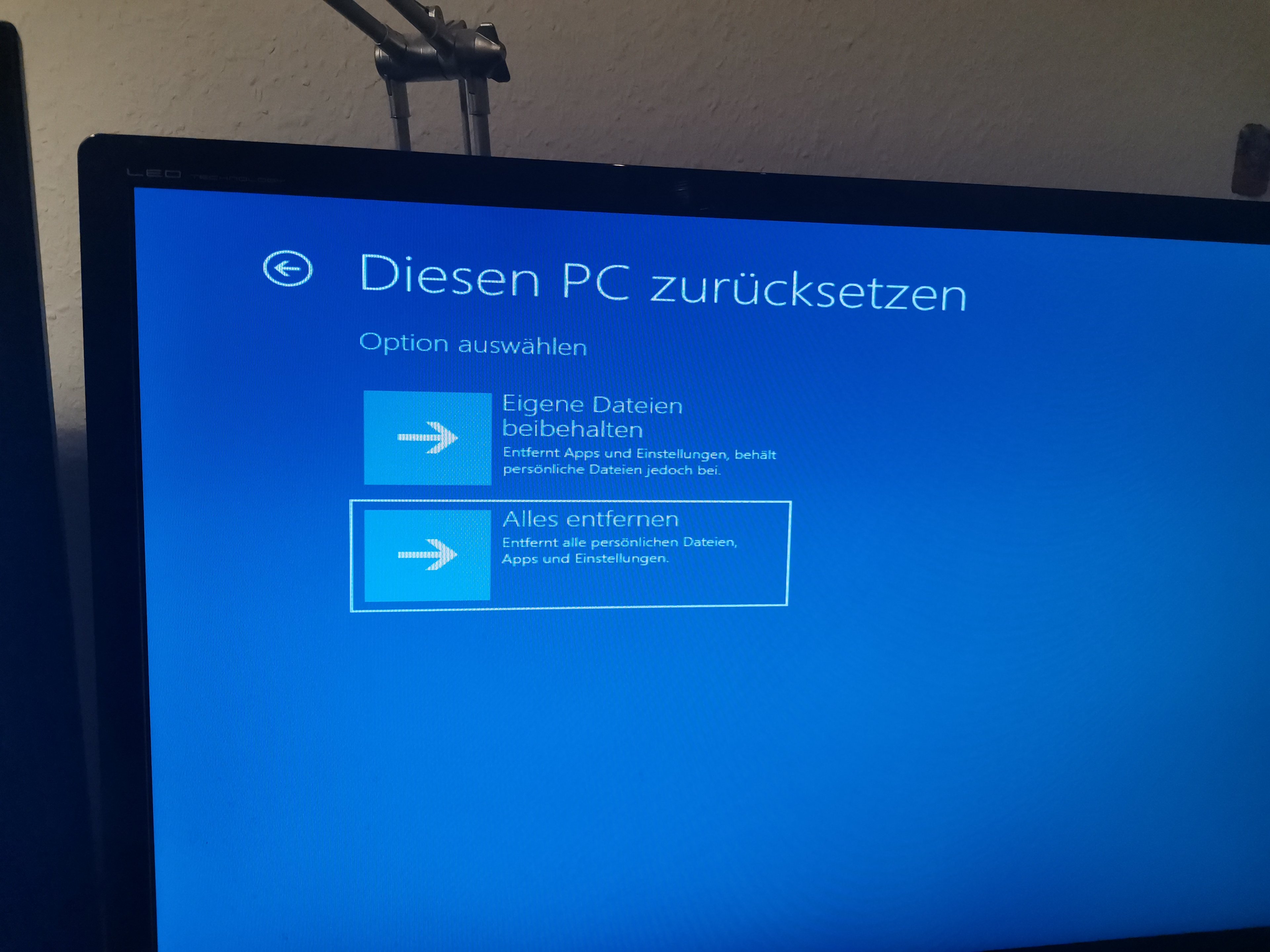 In letzter Zeit wurde es aber schlimmer, und das trotz neuer Samsung SSD fürs Betriebssystem. Darum hab ich mich entschlossen meinen PC zurücksetzen. Ich habe vorher schön alle meine Fotos und Videos und so auf extra sticks gespeichert, und bin dann hochmotiviert in die Einstellungen gegangen, und habe ein Youtube tutorial zum Thema PC zurücksetzen befolgt.