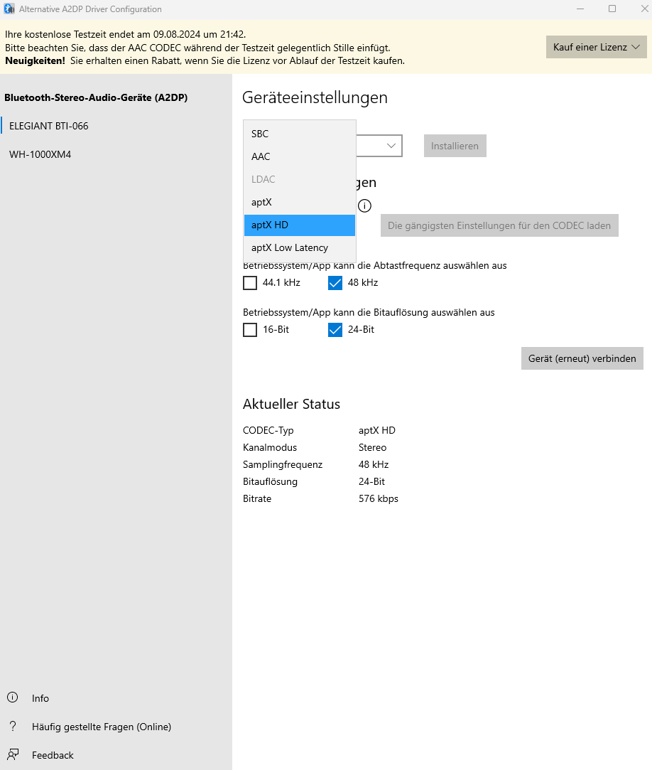 Automatisch werden meine DACs erkannt, können aber nur den AAC Codec verwenden.