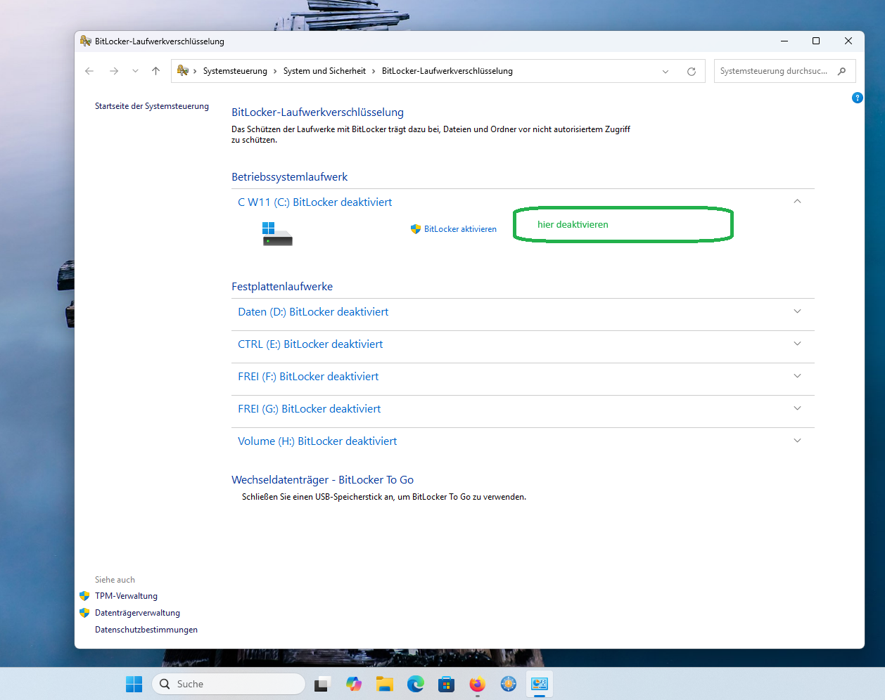 Im Bios?Pentagon schrieb:BitLocker Verschlüsselung deaktivierst