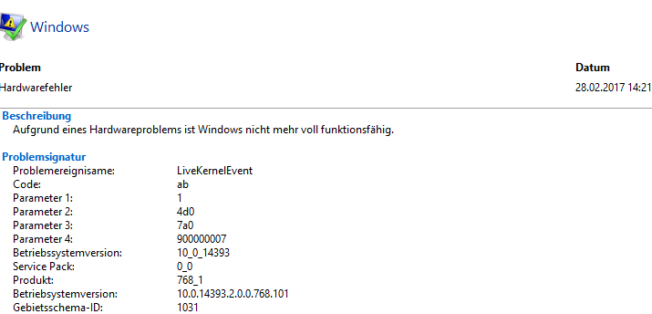 Hey seit dem Update auf windowsversion 1607 habe ich im zuverlässigkeitsverlauf einträge namens "hardwareproblem" - windows die dann so aussehen wenn ich sie mir ansehe: