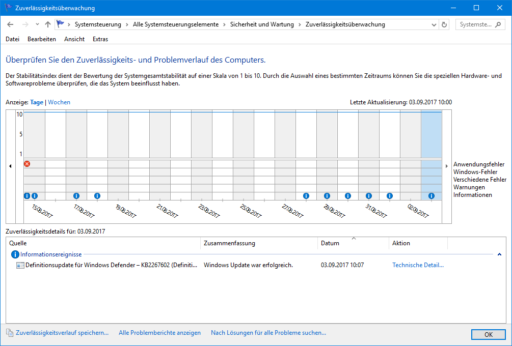 Ist der Zuverlässigkeitsverlauf etwa mittlerweile so "smart" und zeigt die meist irrelevanten und für Normaluser ohnehin unverständlichen Fehlermeldungen (die einen nur geckig machen aber in 99,99% der Fälle nicht weiterhelfen)