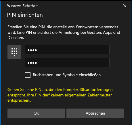 ich sitze bei einem Bekannten, der Probleme beim Upgrade auf 1809 hatte. Er hatte vor dem Upgrade ein Offline Konto und den Rechner mit der PIN "0000" gesperrt. Jetzt erfolgreich auf 1809 aktualisiert, online Konto angelegt und die PIN war weg. Er musste sich mit dem Kennwort anmelden. Danach habe ich ihm die PIN wieder einrichten wollen, aber Windows sagt nun immer dass die PIN zu einfach sei. Weiß jemand eine Lösung?
