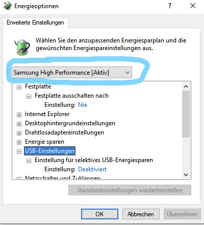 Schau mal unter den Energieoptionen von Windows 10 und schmeiß diese Optimierungen von Samsung raus: