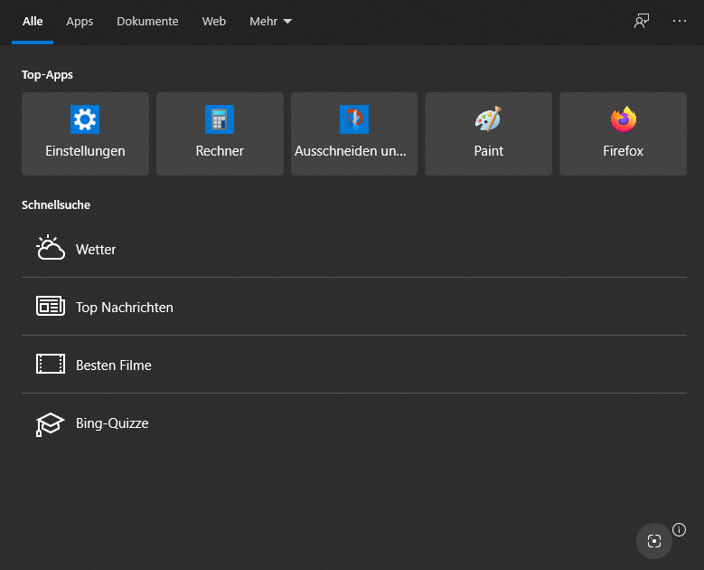 Interessanterweise werden nach Deaktivierung der Schnellsuche jetzt andere Top-Apps angezeigt. Immer noch nicht das, was ich als meine Top-Apps sehe (Chrome, Steam, GOG Galaxy) aber immerhin Apps, die ich schon ab und zu mal aufgerufen habe.