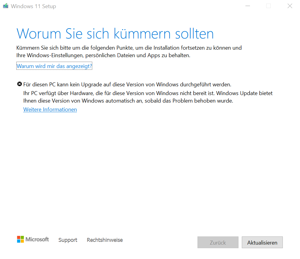 Windows 10 auf 11 Update - Hardware noch nicht bereit