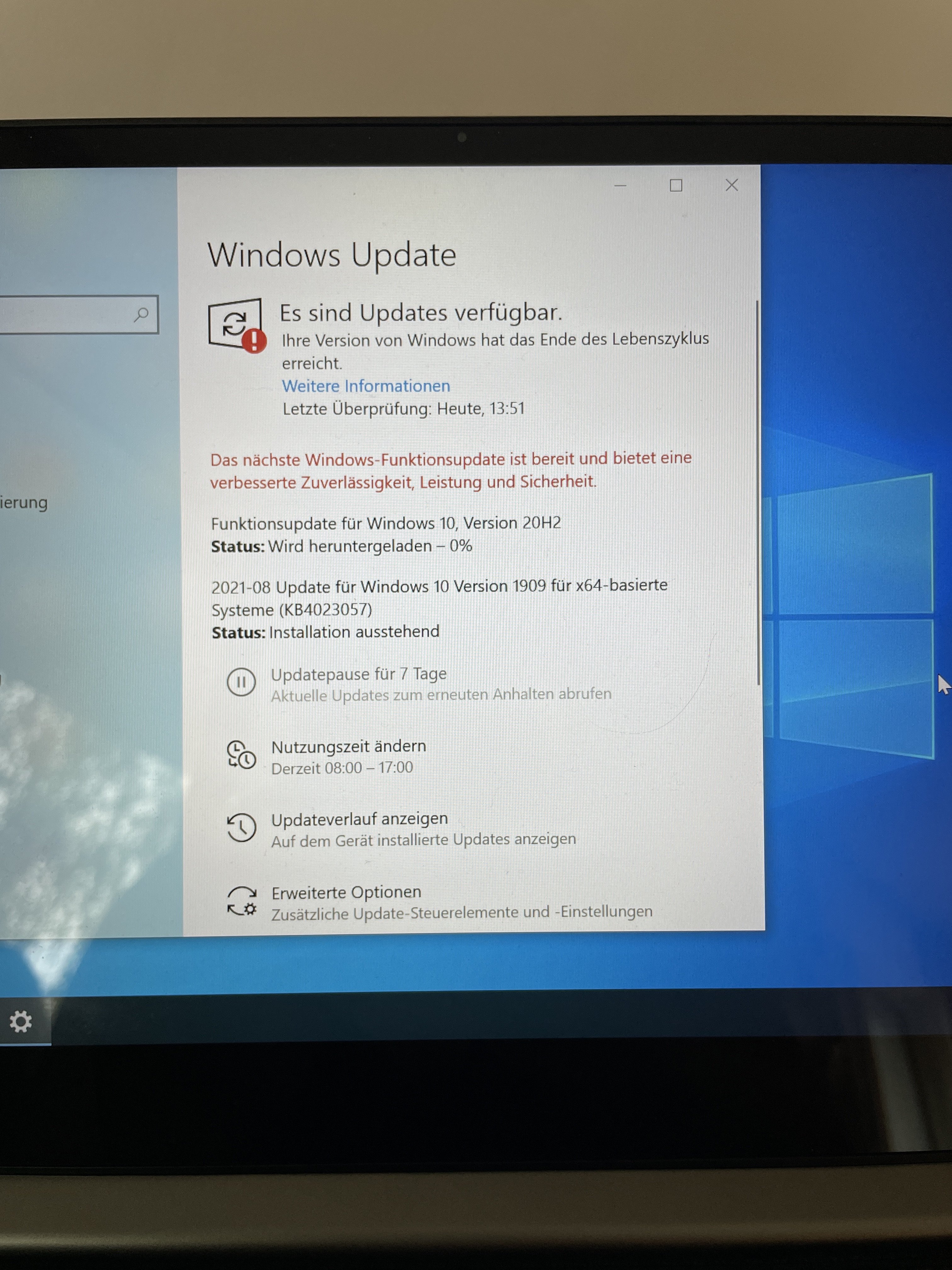 ich habe heute meine Windows 10 (Build 1909) über Windows Update auf Build 20H2 updaten wollen. Das Update wurde geladen und Windows forderte einen Neustart. Seit diesem Neustart hängt der Laptop beim Boot Logo fest (seit mind. 30min)… ohne drehende Punkte…