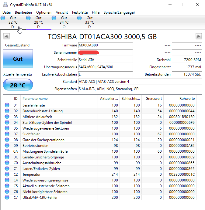 Hab mir das Ganze mit Crystaldysk angeschaut konnte aber nichts feststellenKronos60 schrieb:Du kannst CrystalDiskInfo drüber laufen lassen:
