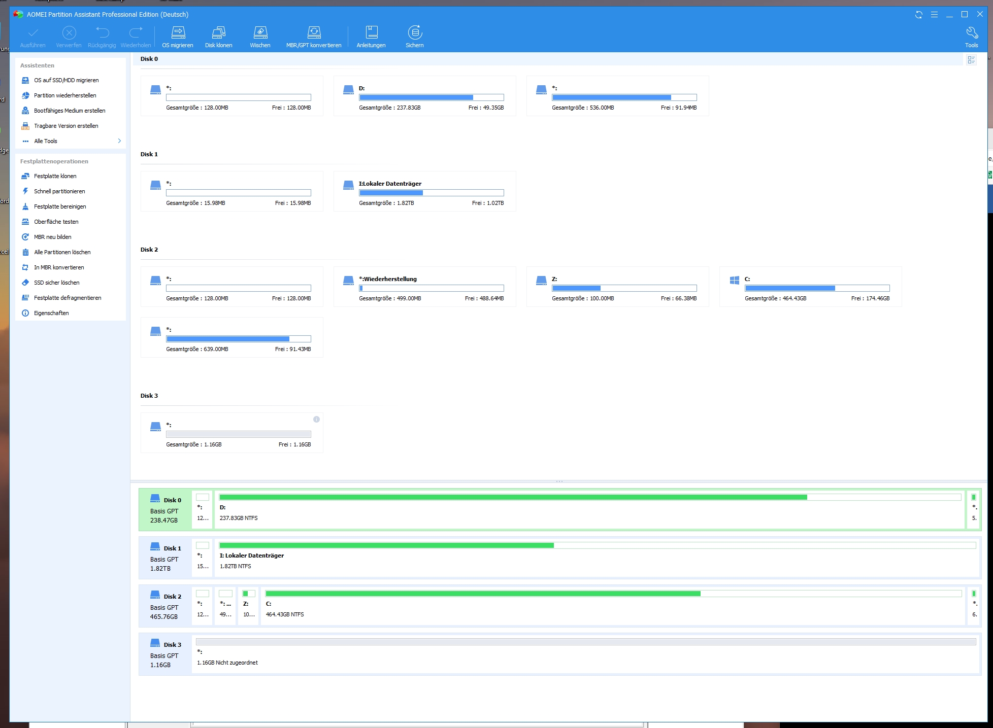 Folgendes habe ich bisher versucht. Mit AOMEI Partition Assistant Professional hab ich „Fix MBR“ durchgeführt. Auch eine Konvertierung der 1. SSD von GPT zu MBR unter Beibehaltung der Daten hat nichts gebracht.