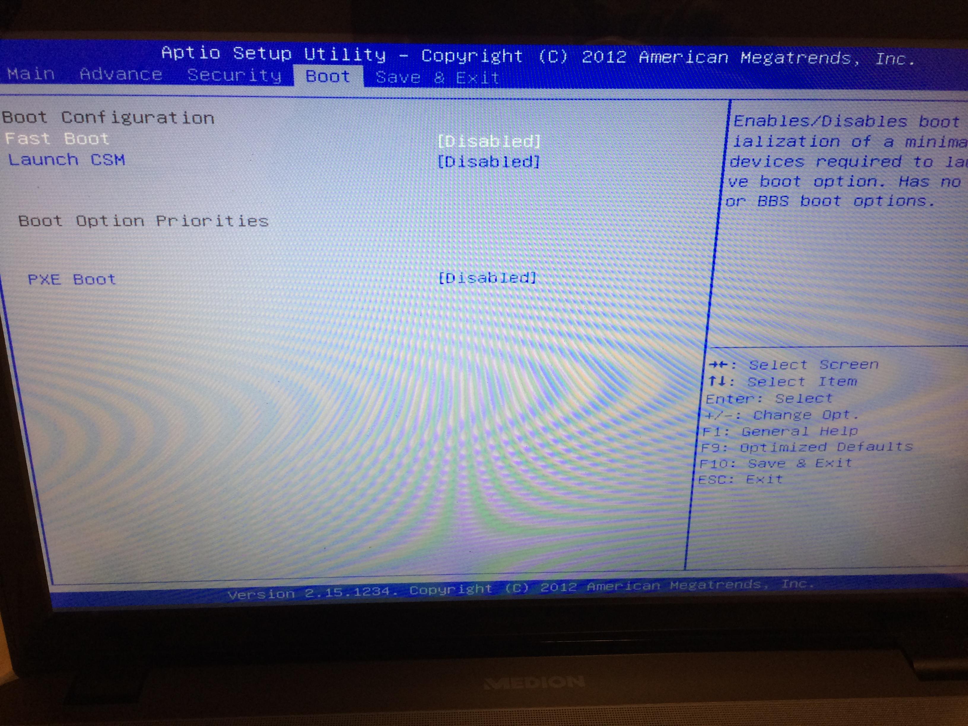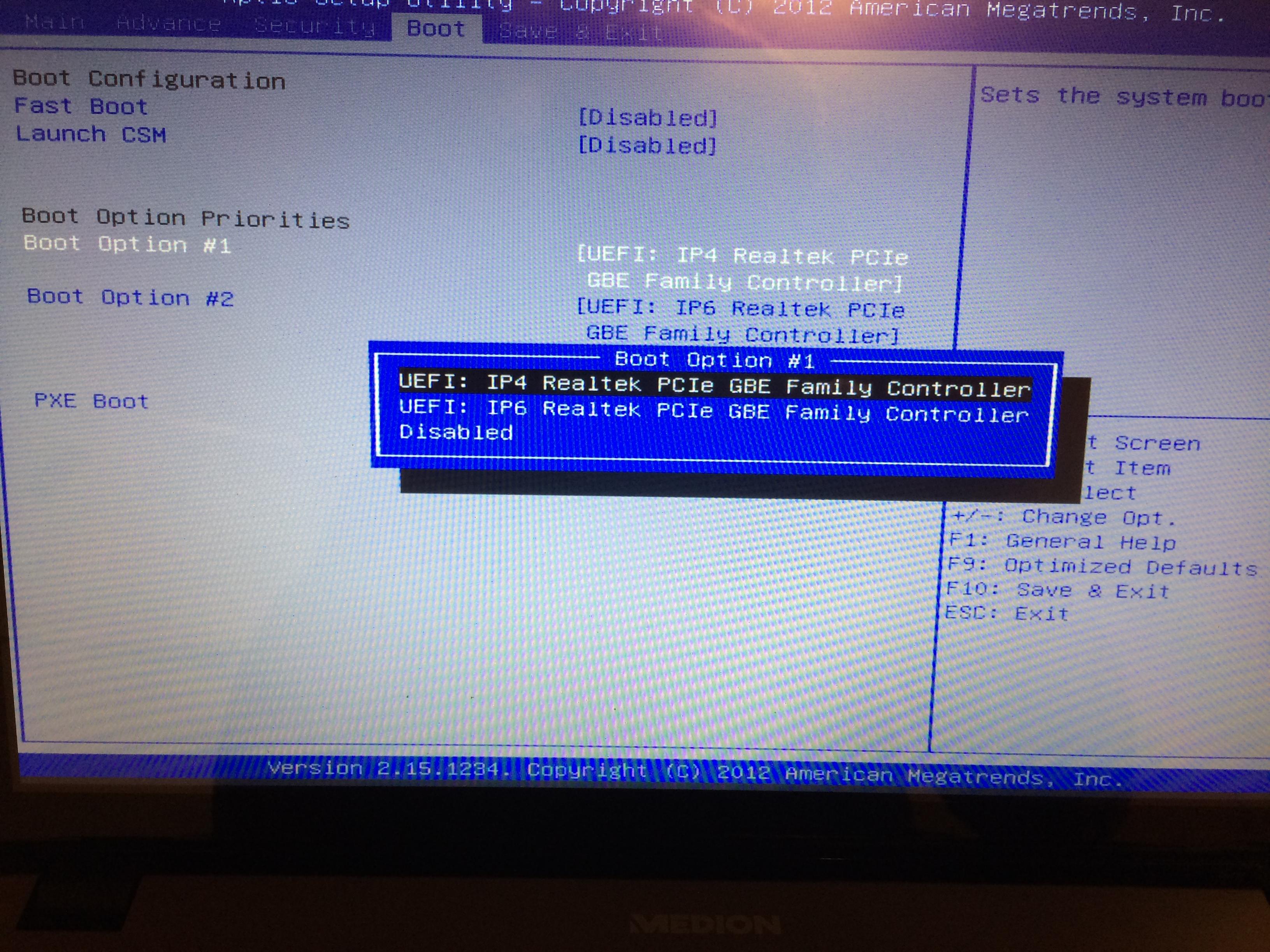 Im Normalfall, nach Einschalten des Notebooks, öffnet sich das BIOS-Menü. Unter Boot-Optionen findet man dann nur die Internetprotokolle IPv4 und IPv6, keinen Windows-Boots-Manager (also keine Festplatte).
