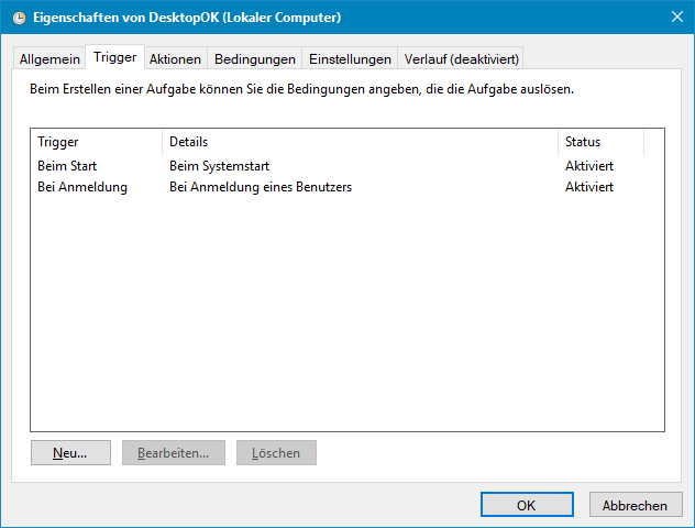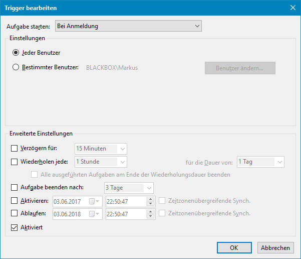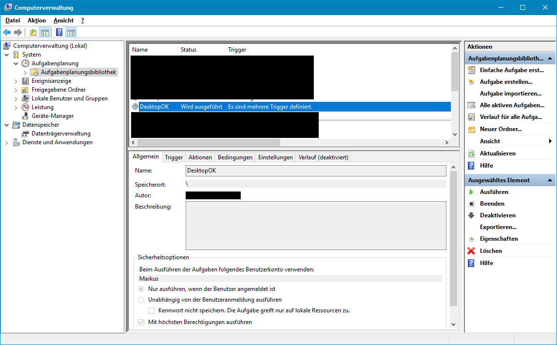 Sollte es Probleme mit dem Autostart geben bei dem Tool, dann könnt ihr auch als Ersatz eine Aufgabenplanung in Win10 dazu anlegen. Hierfür hab ich euch ebenfalls die richtigen Screens mit angehangen an den Beitrag. Sollte es übrigens Probleme mit der Anordnung nach dem Neustart geben, wenn ihr meine Einstellung von den Bildern benutzt, dann entfernt bitte den Hacken bei "Wiederherstellen aus ausgewähltem Layout" im Tool. Bei Win7 mußte ich den reinmachen und bei einem manchen Win10 auch, aber es kann auch zu Fehlern führen bei manchen Win10 Systemen, daher der Hinweis.