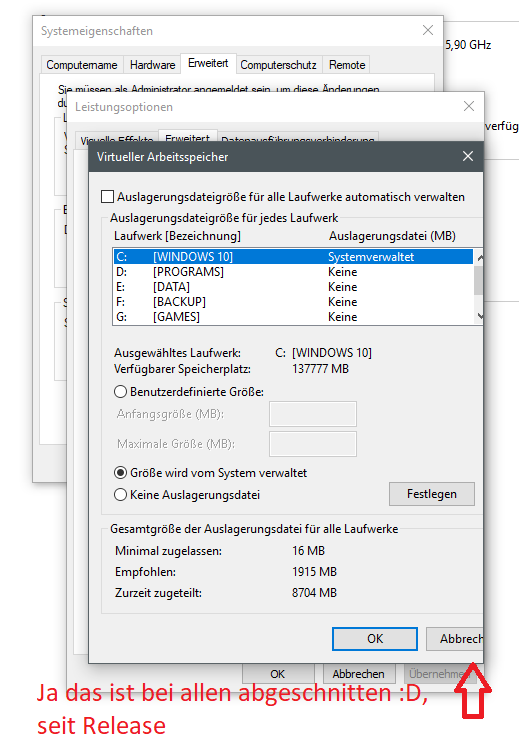Wobei ich MS empfehlen würde, ganz auf irgendwelche Auslagerungsdatei-Einstellungen zu verzichten. Fix vom System gemanagt, und gut ist. Dann müssen sie das Fenster auch nicht reparieren![]()