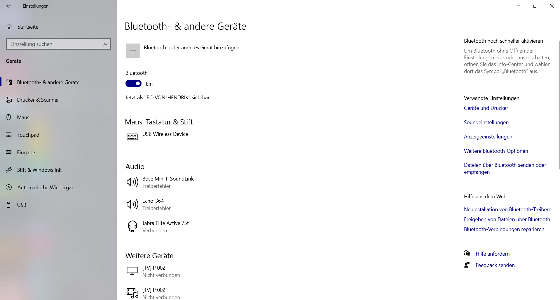 mein Problem ist es das Windows 10 mein Bluetooth Kopfhörer nicht richtig erkennt siehe Bild. Er verbindet sich aber ich kann ihn nicht als Audiogerät auswählen.