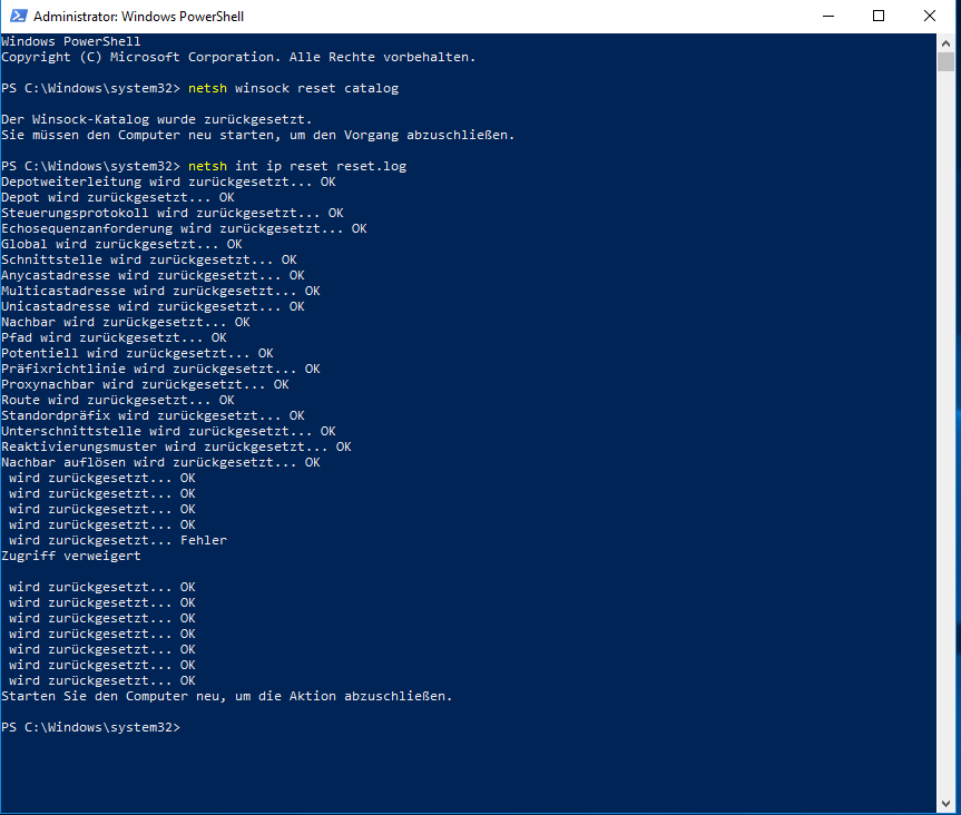 Die Befehle „netsh winsock reset catalog“ und „netsh int ip reset reset.log zeigen folgendes Ergebnis: