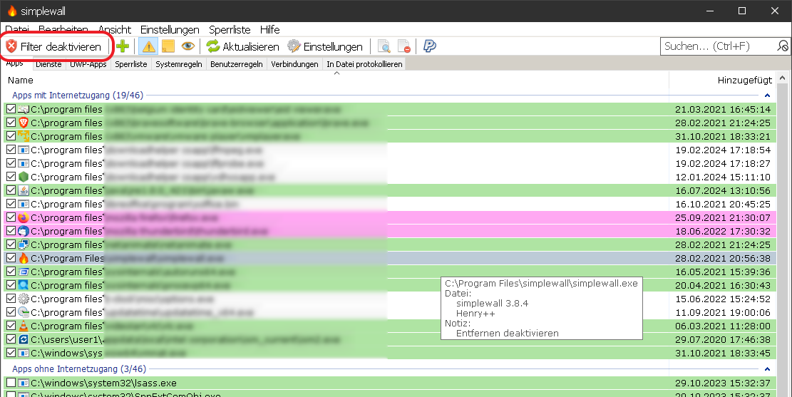 Früher habe ich mir mal die Mühe gemacht (zu Tiny Firewall Zeiten) Gruppen anzulegen z.B. DNS, DNS HTTP, DNS HTTP HTTPS etc. pp. und habe zu den jeweiligen Gruppen die Programme zugeordnet. Das wäre mir aber heutzutage zu aufwändig.
