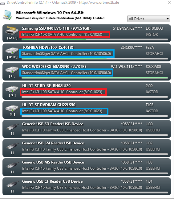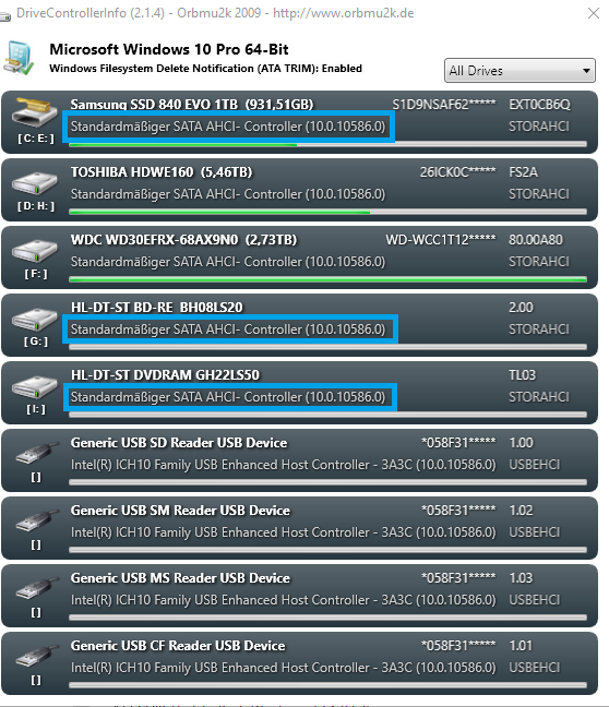 Also einen günstigen PCIe SATA Controller gekauft, eingebaut, die beiden großen internen Platten abgehängt, Upgrade auf Windows 10 vorgenommen, Platten an die beiden zusätzlichen Anschlüsse gehängt, BIOS überprüft. Ergebnis: Alles einwandfrei, Benchmarks sind ok.