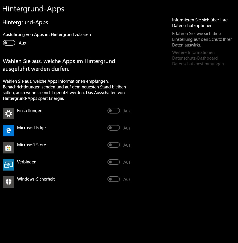 In den Datenschutzeinstellungen > Hintergrundapps würde ich nichts verstellen, es kann Nachteile auf den Antivirus-Scanner und Windowsupdate etc. haben.