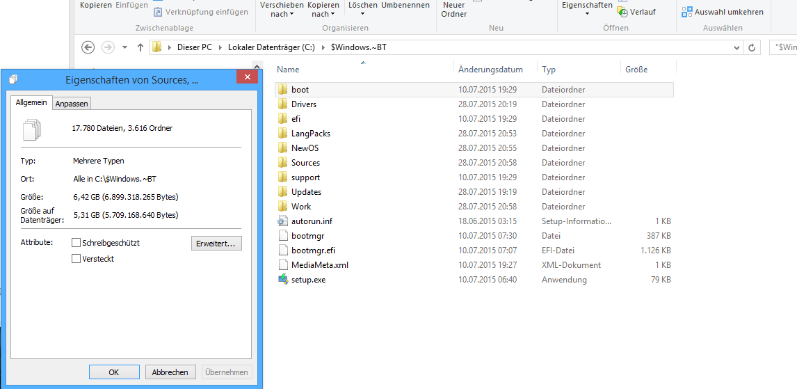 hat jemand schon die Installationsdateien auf dem PC? Angeblich sollen diese doch nur 3GB groß sein. Habe bei mir standardmäßig versteckte sowie Systemdateien angezeigt und bei mir unter C einen "$Windows.~BT" Ordner festgestellt, welcher ziemlich genau 6GB groß ist. Zudem zeigt mir die Datenträgerbereinigung an dass 6,15GB "Temporäre Windows-Installationsdateien" gelöscht werden können. Ordner beinhaltet auch Bootloader etc. PP ...