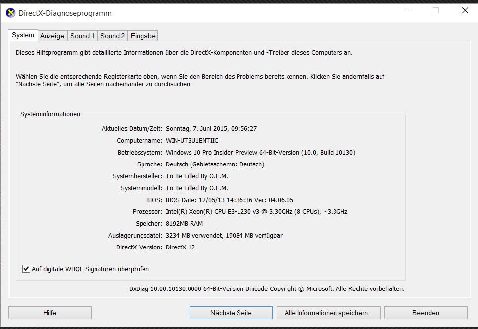 NMA schrieb:Das mag ja vielleicht eine recht bescheidene Frage sein über deren Sinn oder Unsinn sich streiten lässt, doch ist in den "Vorab" Builds von Windows 10 Direct X 12 vollständig implementiert und auch nutzbar?