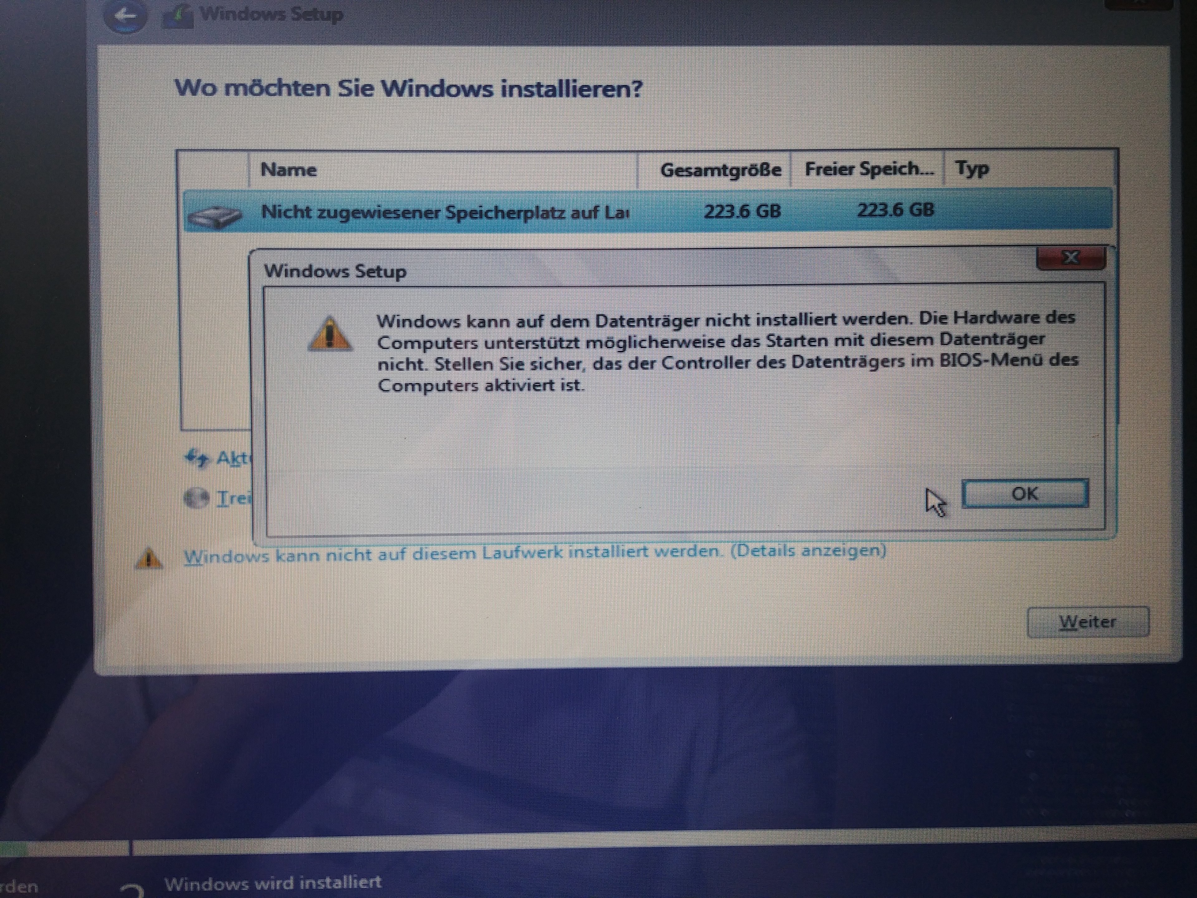 "Windows kann auf dem Datenträger nicht installiert werden. Die Hardware des Computers unterstützt möglicherweise das Starten mit diesem Datenträger nicht. Stellen Sie sicher, das der Controller des Datenträgers im BIOS-Menü des Computers aktiviert ist"