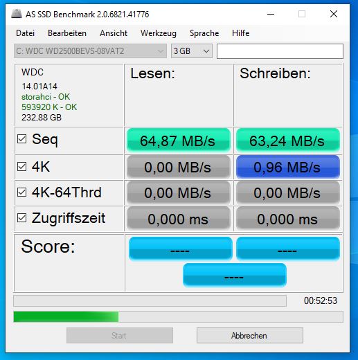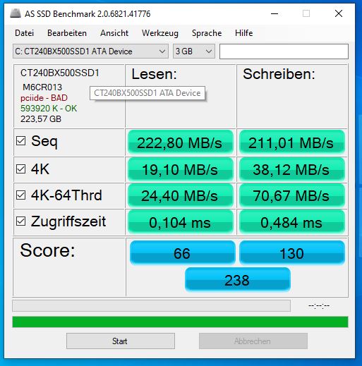 Interessant ist das die BX500 weitaus bessere Schreibwerte im SequentialWrite für CrystalDiskMark aufweist als die Toshiba TR200. Allerdings auch nur dort. Dafür ist sie aber in allen anderen Werten und auch im AS SSD Benchmark gleichauf bzw. schneller als die BX500 und hat auch aktiviertes AHCI. Also bleibt sie drin und die BX500 geht zurück.