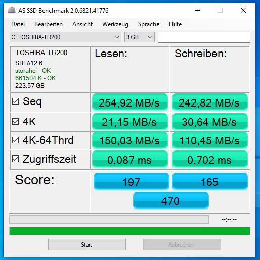 Zum Vergleich hier nochmal ebenfalls die Benchmarks der Toshiba TR200 mit Windows 10 -