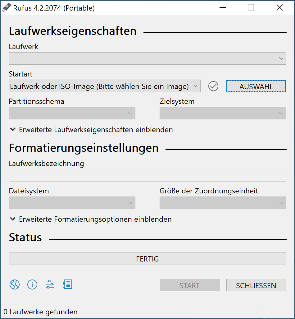 Erscheint der kleine Pfeil nicht, dann blockiert deine Firewall (oder was anderes) Rufus beim Download.