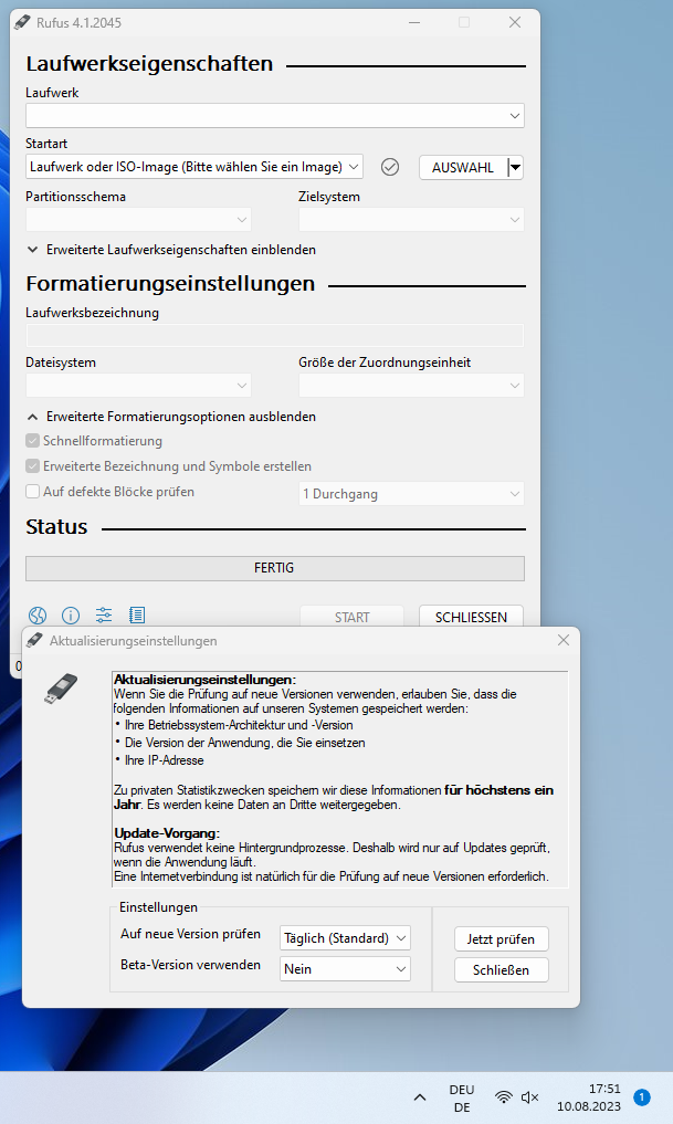 Und wenn man hier wählt, dass Rufus für sich nach neuen Versionen sucht,