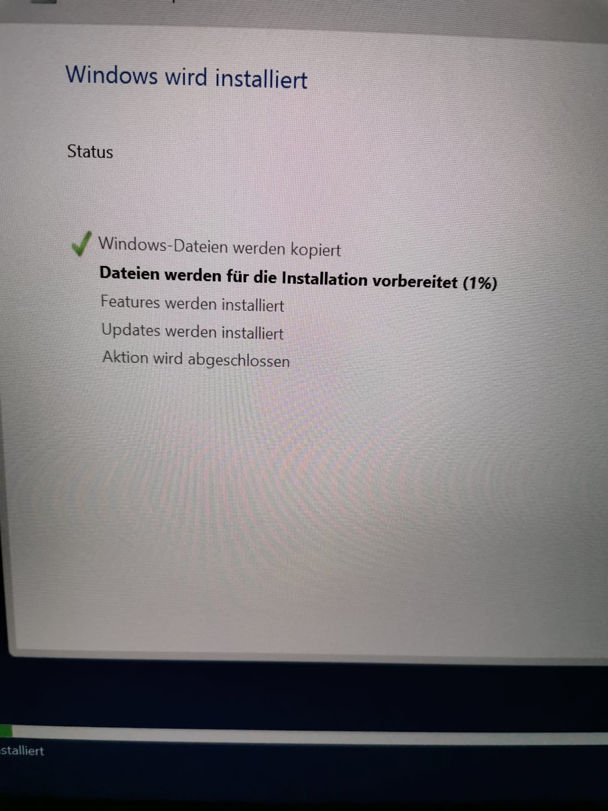erhalten. Ich wollte Windows per USB stick installieren und alles klappt, außer das die Installation bei "Dateien werden für die Installation vorbereitet" immer bei 1% stehenbleibt. Habe schon viele Tipps im Internet probiert. Halt alle Partitionen zu löschen. Nichts funktioniert. (Einmal ging es bis 13% bevor es aufgehört hat weiterzuladen, ich weiß nicht warum). Wollte fragen ob hier jemand Tipps hat. Einen Laptop wegen sowas zurückschicken zu müssen wäre doof.Im Anhang ein Bild vom Ladescreen, der sich stundenlang nicht verändert. Bin leider kein Technik Experte weshalb ich nicht weiß welche Infos ich hier geben muss bzw. gebraucht werden. Deshalb gerne nachfragen.