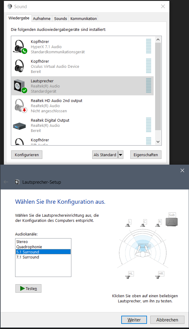 habe ein Windows 10 Pro 64 bit System und nutze den Onboard 5.1 Sound. Alle Treiber und Updates aktuell.