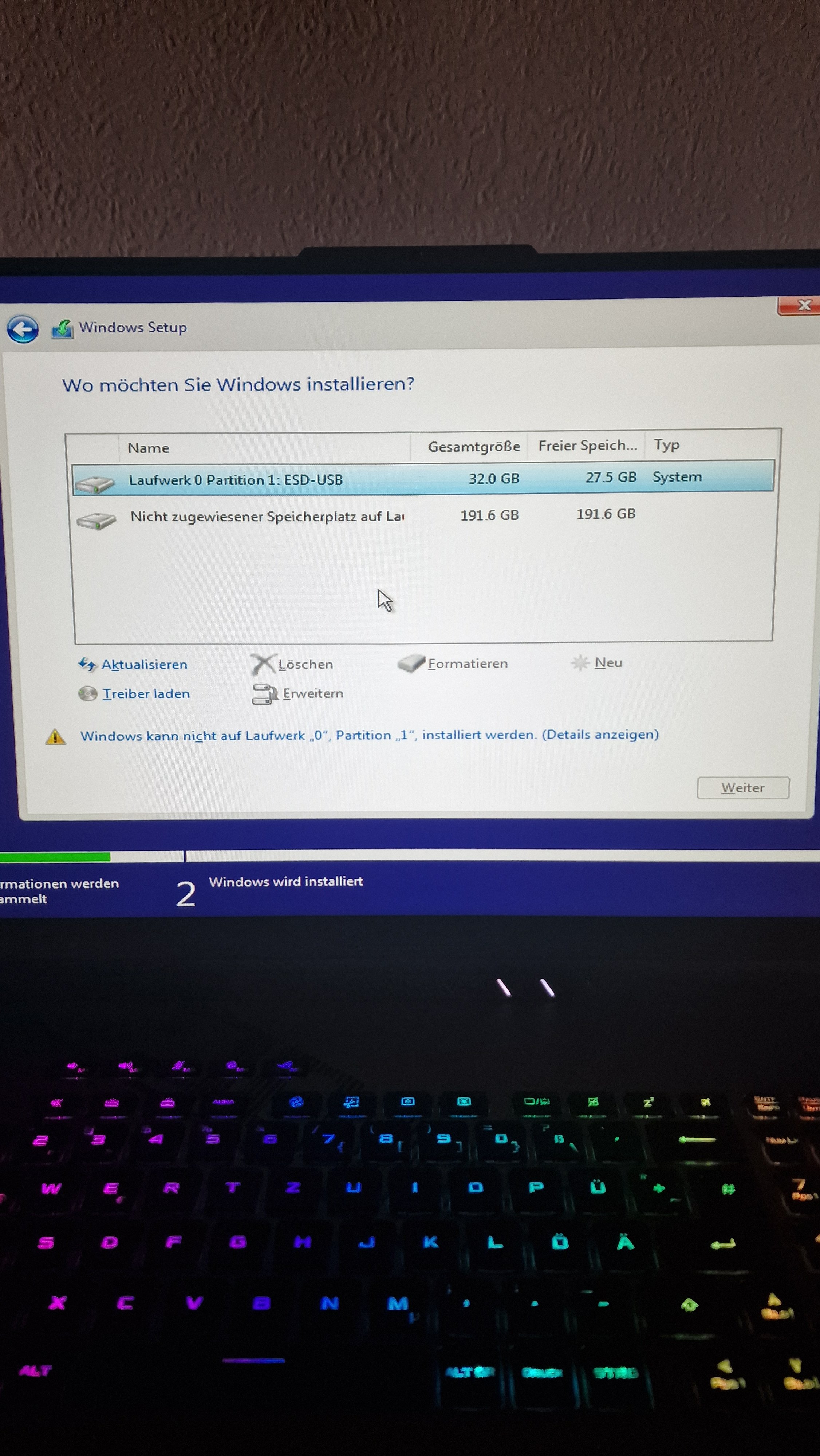 Windows 10 lässt sich nicht installieren, Partition wird nicht angezeigt.