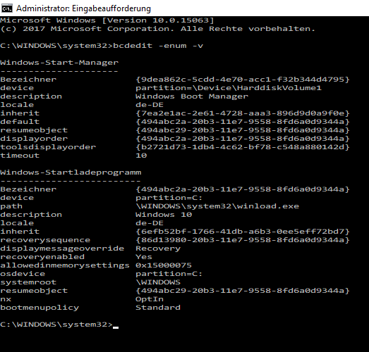 Ausserdem würde ich mal die Timeouts des Bootmanagers prüfen, denn wenn der Start eine Weile am Windows-Logo hängen bleibt, dann könnte hier auch ein nicht sichtbares warten auf eine Benutzerauswahl zum Start des Standardsystems eine Rolle spielen. Die Ausgabe des Befehls: bcdedit -enum -v, den man in einer Eingabeaufforderung mit Adminrechten ausführt, sollte darüber Aufschluss geben. Es wäre nicht ungewöhnlich, wenn der Bootmanager eine ehemalige Vorversion noch als Starteintrag rumschleppt.