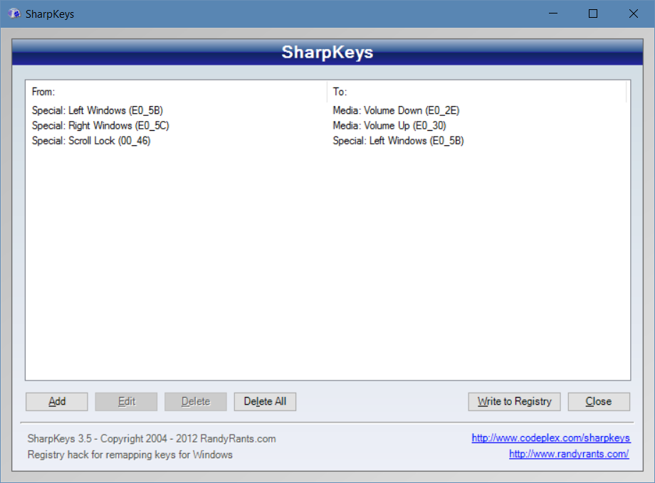 "Scancode Map"=hex:00,00,00,00,00,00,00,00,04,00,00,00,5b,e0,46,00,30,e0,5c,e0, \ 2e,e0,5b,e0,00,00,00,00