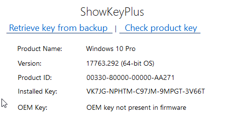 Die Lizenz musste ich mit einem Programm (ShowKeyPlus) auslesen, womit ich folgende einträge bekam: