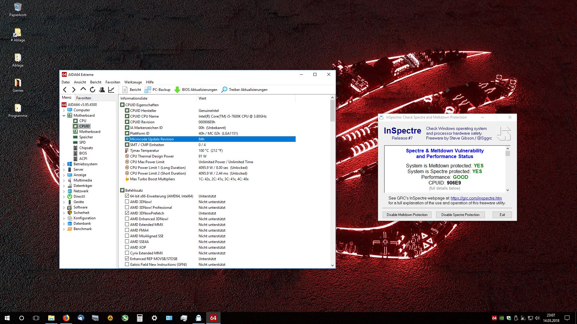 Bei meinem eigenen PC habe ich beide Patches deaktiviert, bei dem PC von meiner Frau mit einem Xeon E3 1231-v3 (Haswell 4C8T) ist Meltdown aktiviert und Spectre deaktiviert, weil sie doch recht regelmäßig auf irgendwelchen Streaming-Seiten ist, um Serien anzuschauen und die Performance des CPUs bei der GTX 1050 Ti ohnehin keine große Einschränkung ist. Sollte irgendwann eine stärkere GPU reinkommen, wird auch bei ihr der Meltdown Fix abgeschaltet.