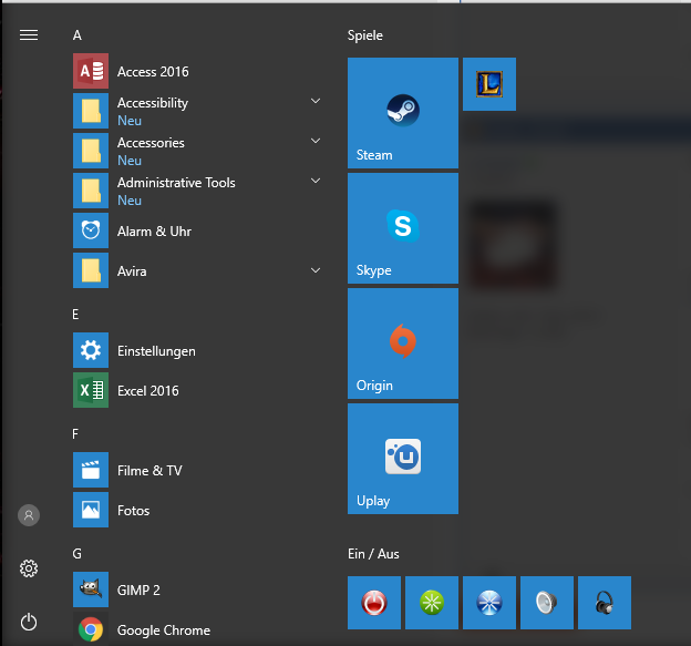 Vor dem Update war die Linke Spalte mit Benutzer und Ein/Aus etwas breiter, die Programme waren weg und es kamen sofort die Kacheln...