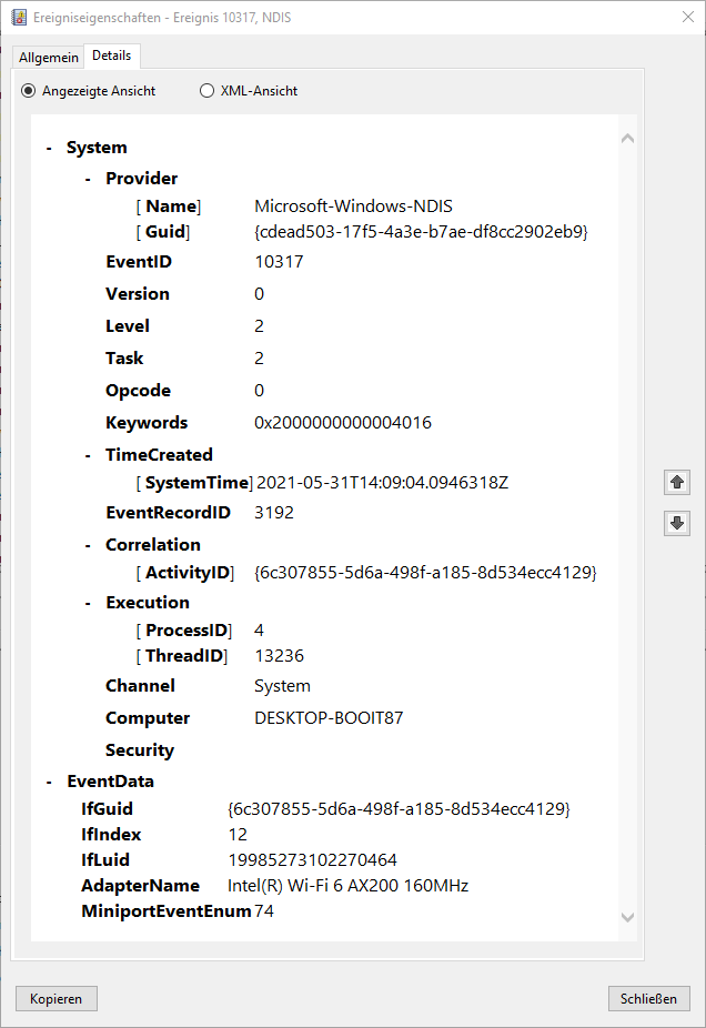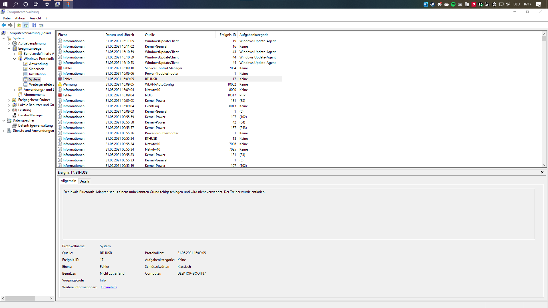 Heute Nachmittag um 16:00 Uhr kam ich von der Arbeit nach Hause, reaktiviere den PC aus dem Standby und sehe als erstes, dass das Bluetooth-Symbol im Systray nicht mehr da ist und ich wusste sofort, was Sache ist, was mir ein Blick in den Gerätemanager auch bestätigte: Bluetooth und WLAN ist wieder nicht mehr vorhanden. Erkenntnis: Windows Updates waren nicht schuld daran, da diese ja deaktiviert sind. Habe dann natürlich wieder die Bluetooth- und WLAN-Treiber deinstalliert und wieder reinstalliert, keine Besserung. Habe dann mal in die Ereignisanzeige geschaut, ob ich was finde und da habe ich dann zwei Fehlereinträge gefunden, die mit WLAN und Bluetooth zu tun haben.