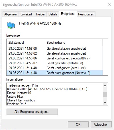 Die WLAN-PCIe-Karte verhält sich hier also so, als wäre sie physisch gar nicht verbaut.Dieses Hardwaregerät ist zurzeit nicht an den Computer angeschlossen. (Code 45)