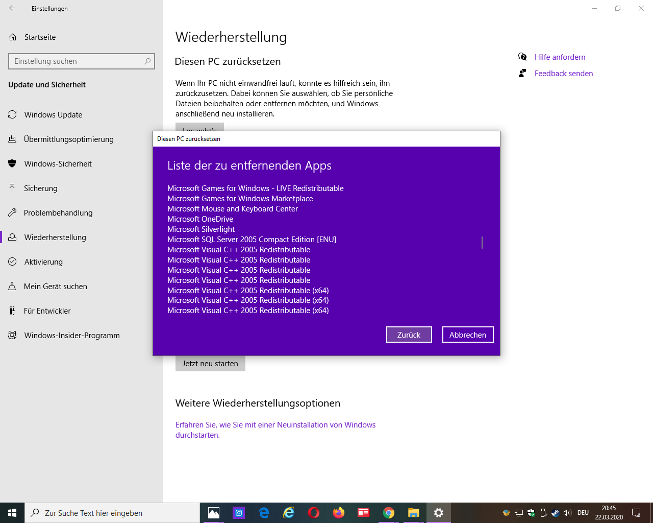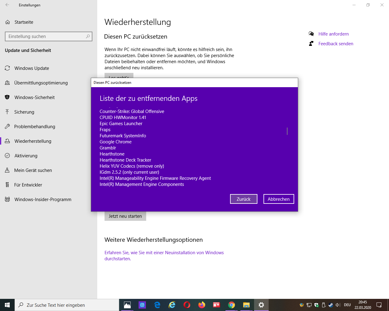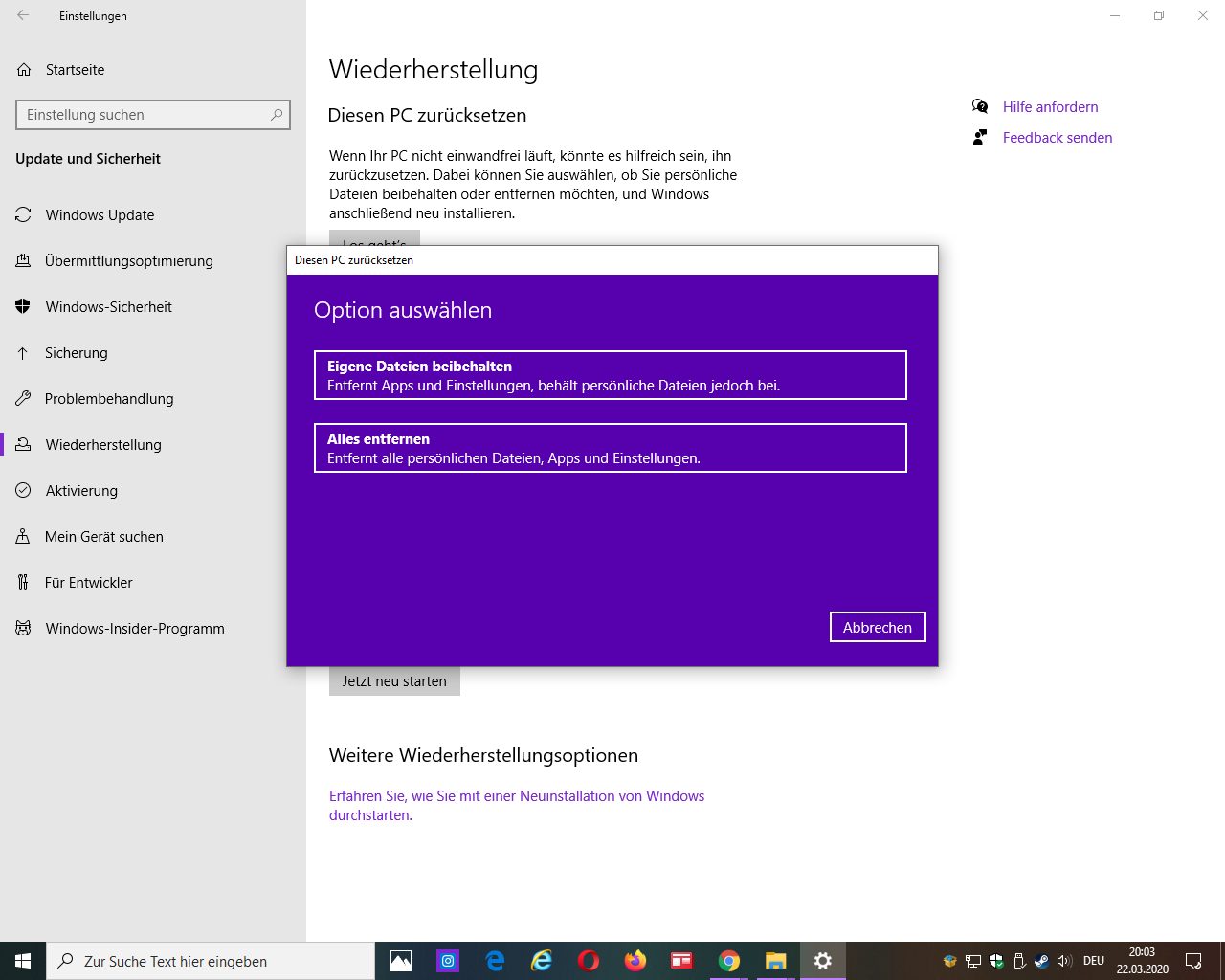 nachdem es nicht funktioniert hat meinen pc zurückzusetzten: entfernen von programmen und apps und eigene dateinen beibehalten siehe bild 1. versuche ich es jetzt mit einer neuinstalltion von windows 10.