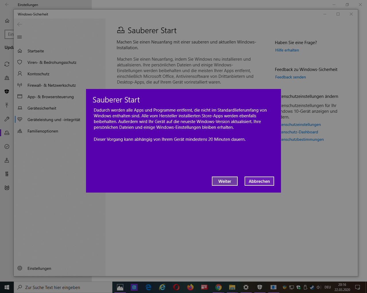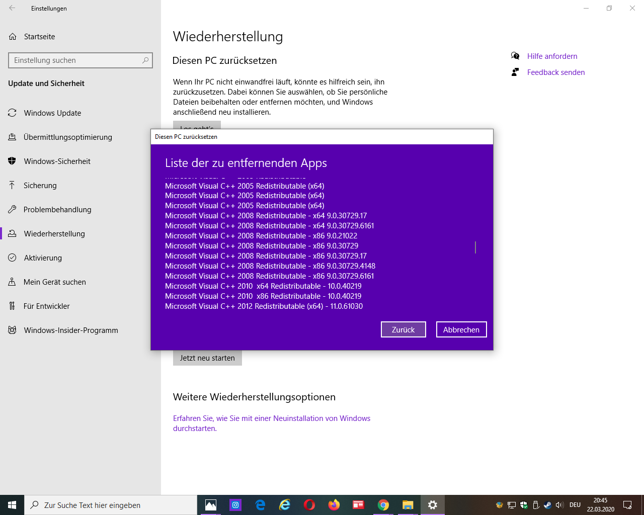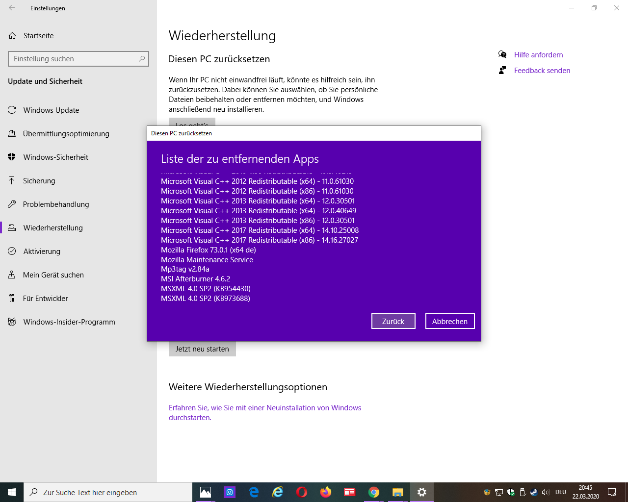 nachdem es nicht funktioniert hat meinen pc zurückzusetzten: entfernen von programmen und apps und eigene dateinen beibehalten siehe bild 1. versuche ich es jetzt mit einer neuinstalltion von windows 10.
