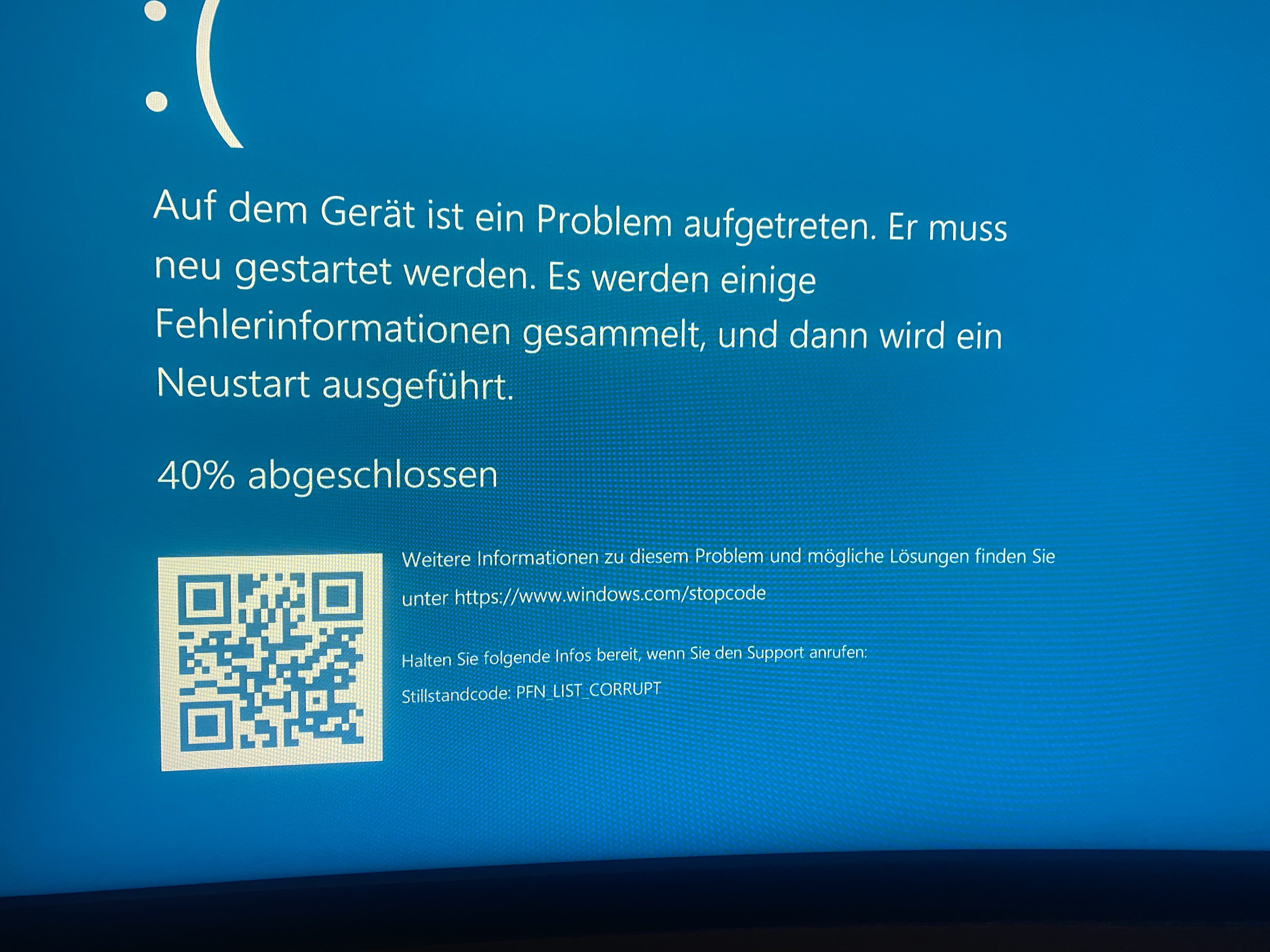 Hallo, da bin ich wieder… um ein bisschen backround zu geben warum ich überhaupt eine neue SSD gekauft hab: ich kriege nicht gerade selten einen Blue Screen mit der Fehlermeldung: PFN_LIST_CORRUPT und meistens die Fehlermeldung wo iwas mit MEMORY_MANAGEMENT steht, davon hab ich aber kein Bild parat gerade. Dazu rastet auch der Ton aus also so als würde der Sound sich auch aufhängen.