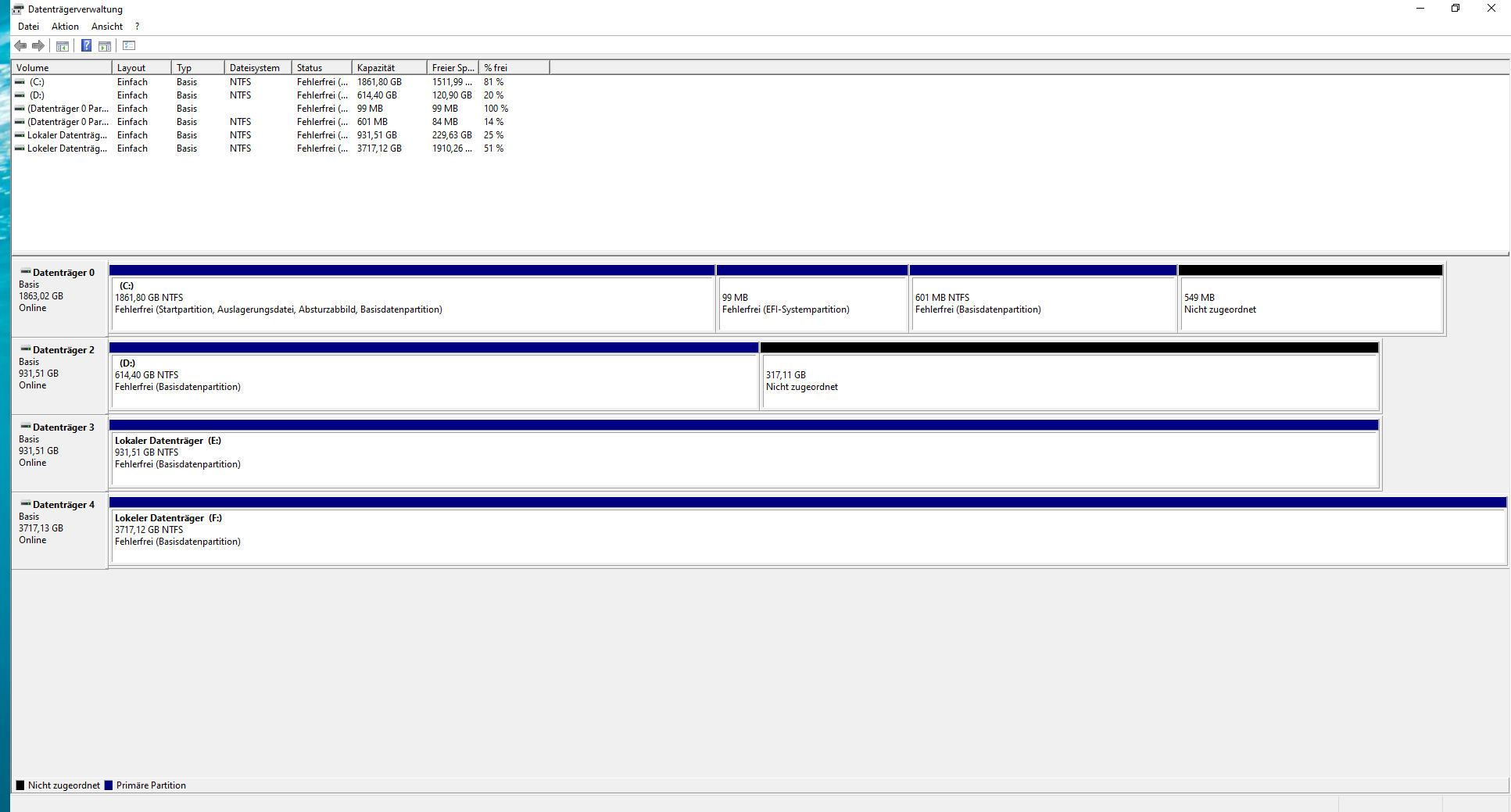 Hey ich habe vor kurzer Zeit beschlossen von meinem Dual Boot mit Windows 10 und Linux Tumbleweed zurück auf Single Boot Windows zu gehen. Also habe ich die Linux Partitionen formatiert und den Windows Bootloader wieder hergestellt, dies hat auch nach einigen Problemen funktioniert. Anschließend habe ich meine Hauptplatte mit den Windows 10 (Sata SSD) Partitionen mit Macrorit Partition Expert Free auf eine neue M2.Sata geklont und meine alte Platte erstmal als Back Up abgesteckt. Danach habe ich mit Paragon Partition Manager die Platte von MBR zu GPT konvertiert. Auch dies hat geklappt, allerdings habe ich jetzt ein paar Probleme. Zum einen kann ich meinen Rechner nicht mehr herunterfahren und zum anderen würde ich gerne ein Inplace upgrade ausführen um etweige beschädigte Systemdatein zu reparieren. Leider bekomme ich da den Fehler, dass nicht festgestellt werden kann, ob mein System über genug Speicher verfügt.