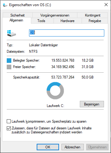 Ein frisch installiertes Windows 10 benötigt über 12GB Festplattenspeicher. Es laufen über 120 Prozesse.