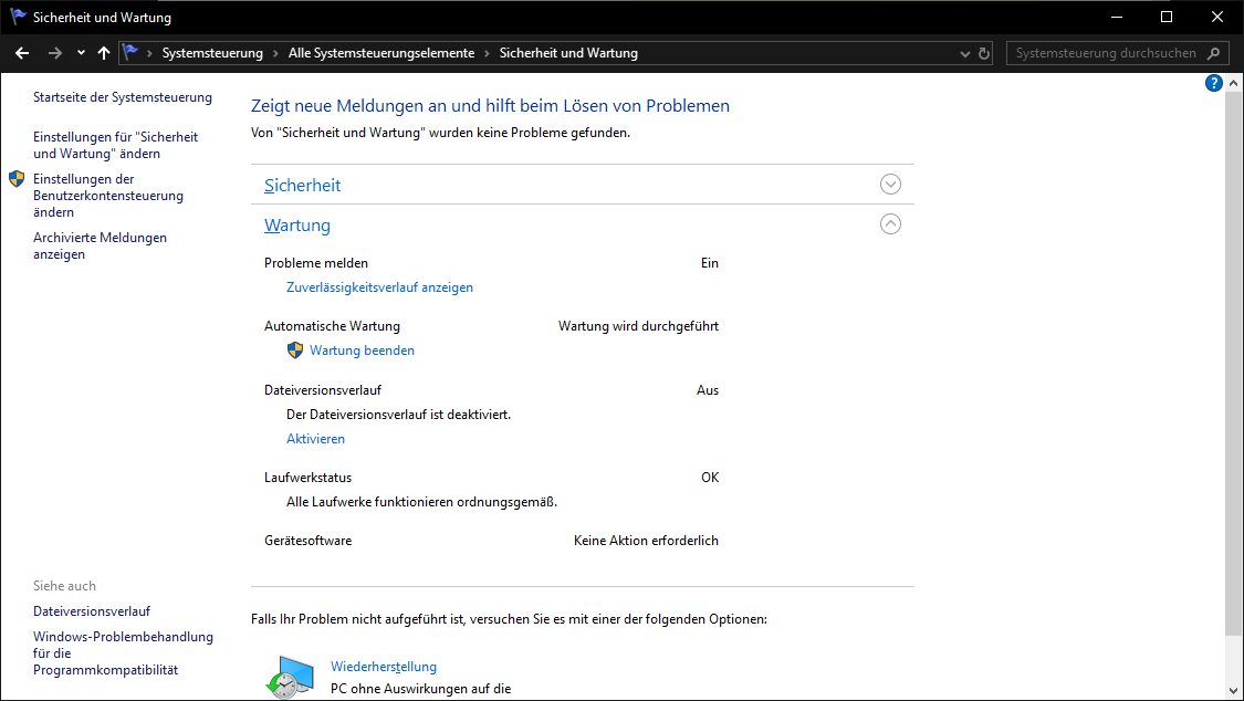 Systemsteuerung\System und Sicherheit\Sicherheit und Wartung