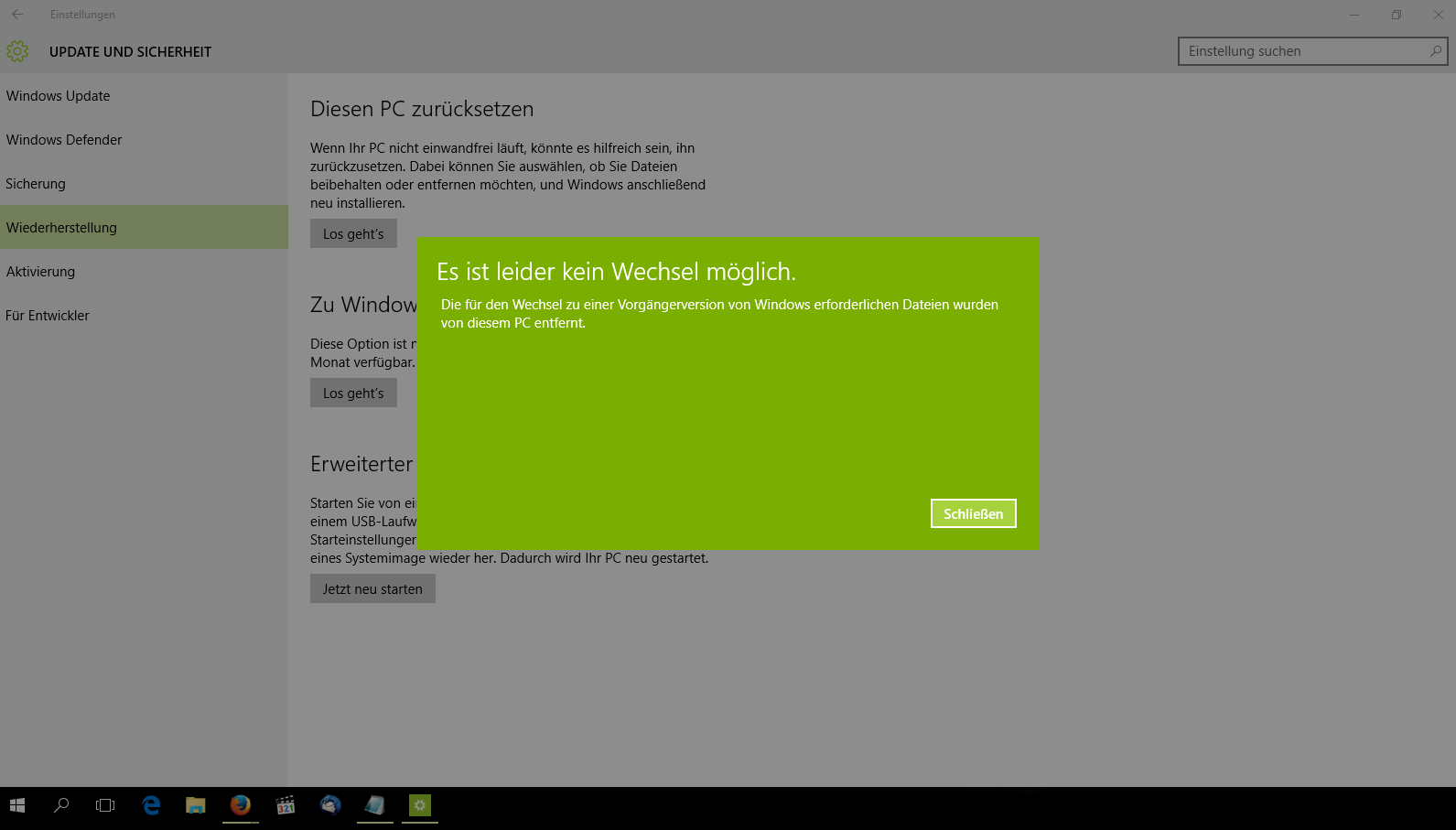 habe heute das Win 10 Upgrade durchgeführt. Hatte vorher Windws 7. Alles schön und gut Win 10 ist nett und so aber einige Programme liefen nicht wie gewüscht und daher wollte ich zurück auf Win 7. Über die Systemsteuerung/ Update und Sicherheit/ Wiederherstellung kann man normalerweise den Rollback /Downgrade durchführen, jedoch kommt bei mir folgender Feher