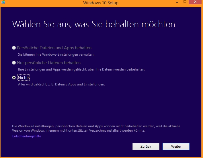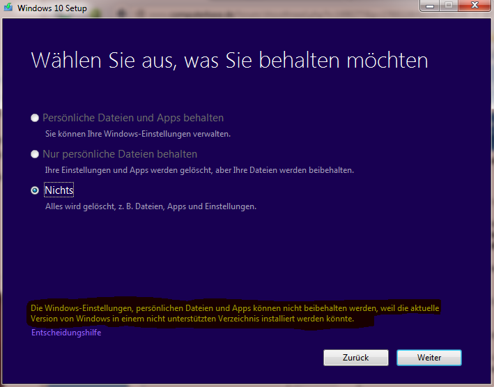Es steht auch unten in der Meldung: Die Windows-Einstellungen, persönlichen Dateien und Apps können nicht beibehalten werden, weil die aktuelle Version von Windows in einem nicht unterstützten Verzeichnis installiert werden könnte.